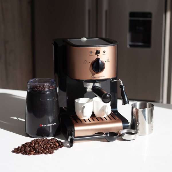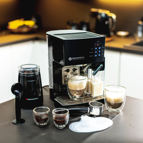 The all-in-one home barista set, EspressoWorks 15-bar Espresso Machine is an easy to use premium espresso machine that comes with an electric grinder, portafilter, ceramic cups, milk frothing pitcher, and more!